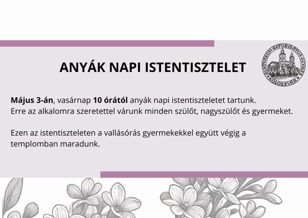 Május 3-án, vasárnap 10 órától anyák napi istentiszteletet tartunk. Erre az alkalomra szeretettel várunk minden szülőt, nagyszülőt és gyermeket.