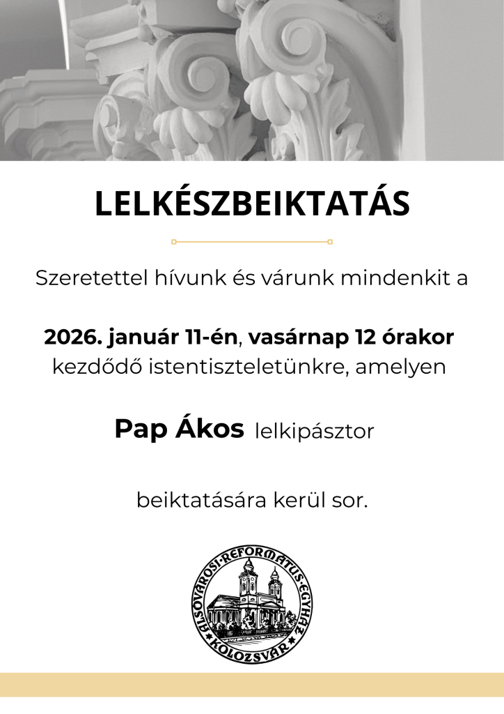Szeretettel hívunk és várunk mindenkit a 2026. január 11-én, vasárnap 12 órakor kezdődő istentiszteletünkre, amelyen Pap Ákos lelkipásztor beiktatására kerül sor.
